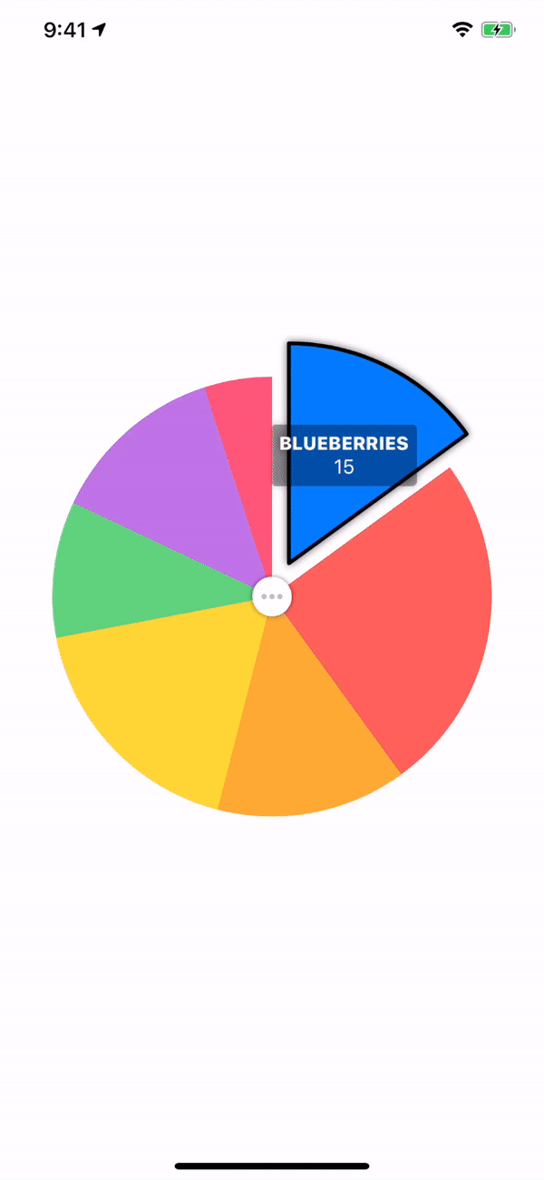 Each segment of the pie should be selectable by the user so that the segment and its value can be highlighted. When selected, a segment should animate out nicely from the center, and the segment’s label and value should be displayed on top of it. Any other segment that was previously selected should animate back into the pie, and it’s label should disappear.
